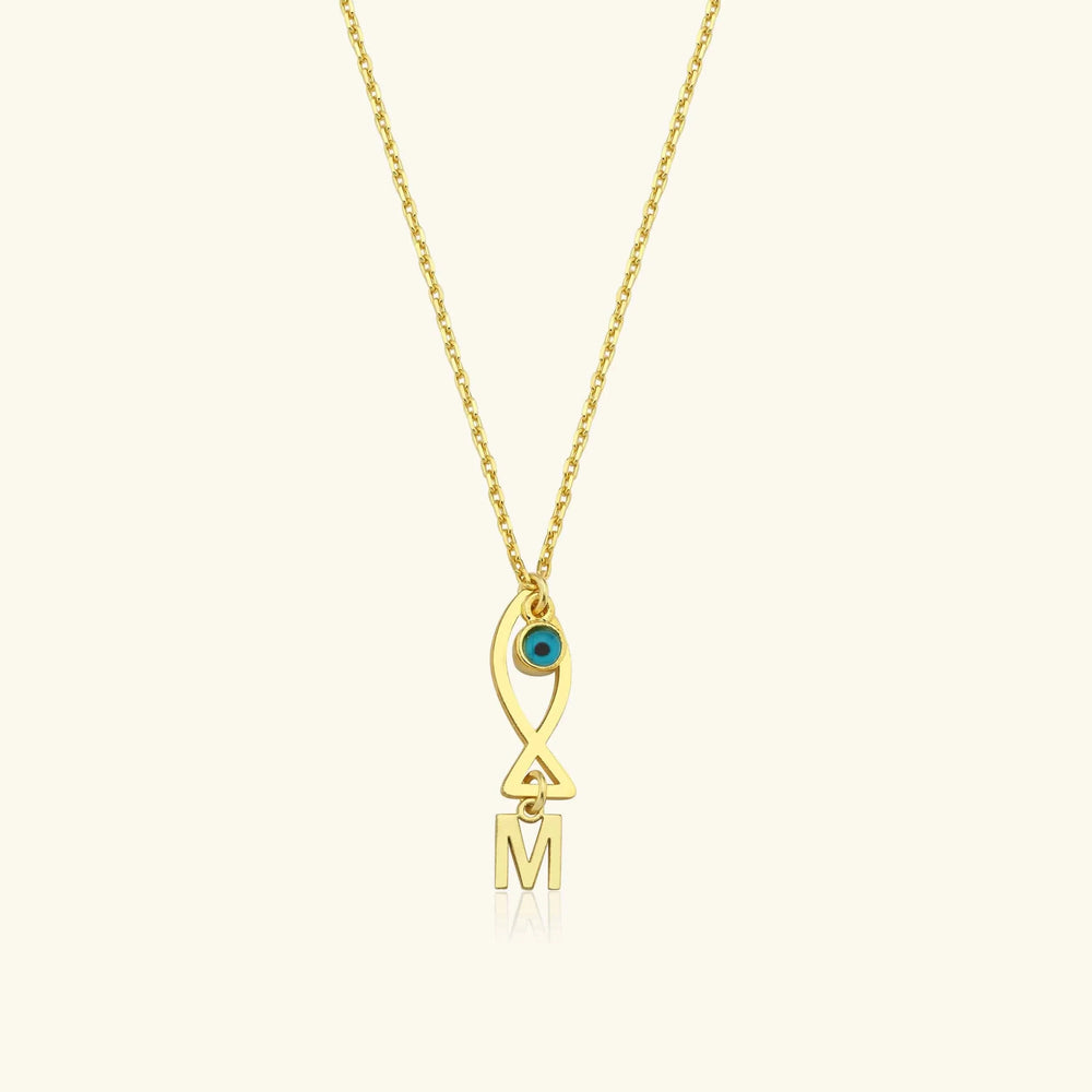 This unique Fish & Initial Charm Necklace blends elegance with personal expression. Crafted from high-quality 925K sterling silver and plated with 18K gold, this necklace features a delicate fish charm, an evil eye accent for protection, and a customizable initial of your choice. Its minimalist yet meaningful design makes it perfect for daily wear or as a thoughtful gift.