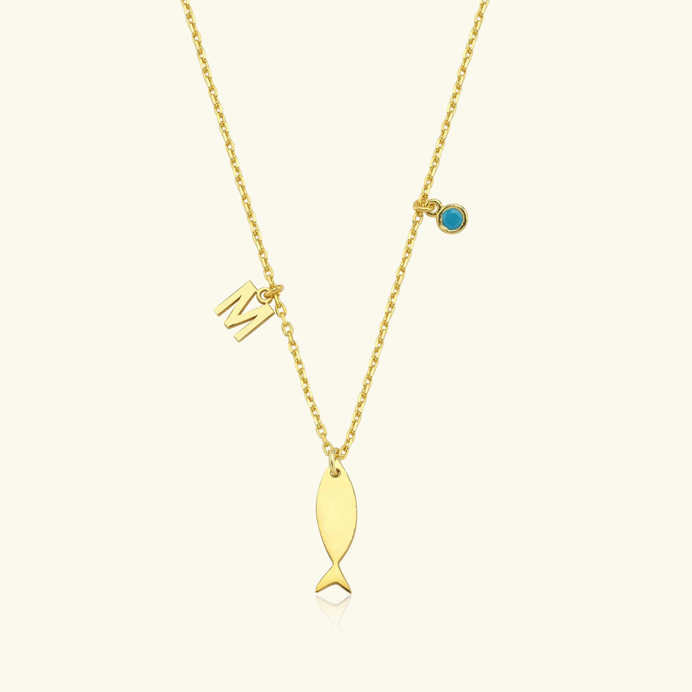 Add a personalized touch to your jewelry collection with this stunning Fish & Initial Necklace. Crafted from high-quality 18K gold-plated sterling silver, this necklace features a sleek fish charm, a customizable initial, and a vibrant turquoise stone accent. Its minimalist design makes it perfect for everyday wear, whether you layer it with other pieces or let it shine on its own.