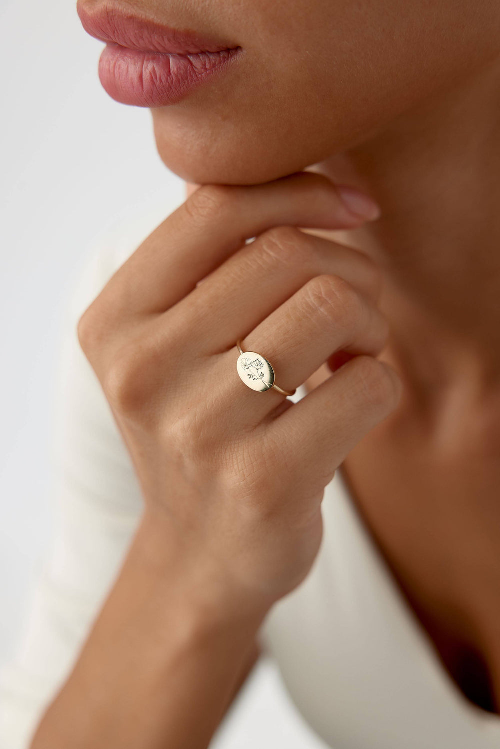 Embrace the elegance of nature with this Floral Engraved Ring. Crafted from 18K gold-plated sterling silver, this delicate ring features a circular disc engraved with a beautiful floral design, adding a touch of grace and femininity to your style. Its minimalist look makes it perfect for everyday wear or stacking with other rings.