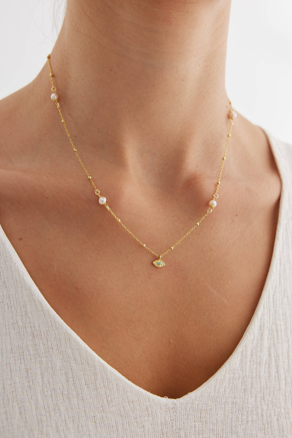 Our Minimalist Handmade Evil Eye Pearl Chain Necklace is elegant, protective, and ageless. A delicate chain with a handcrafted evil eye pendant and freshwater pearls makes this necklace special. High-quality materials make this necklace excellent for adding refinement to any outfit.