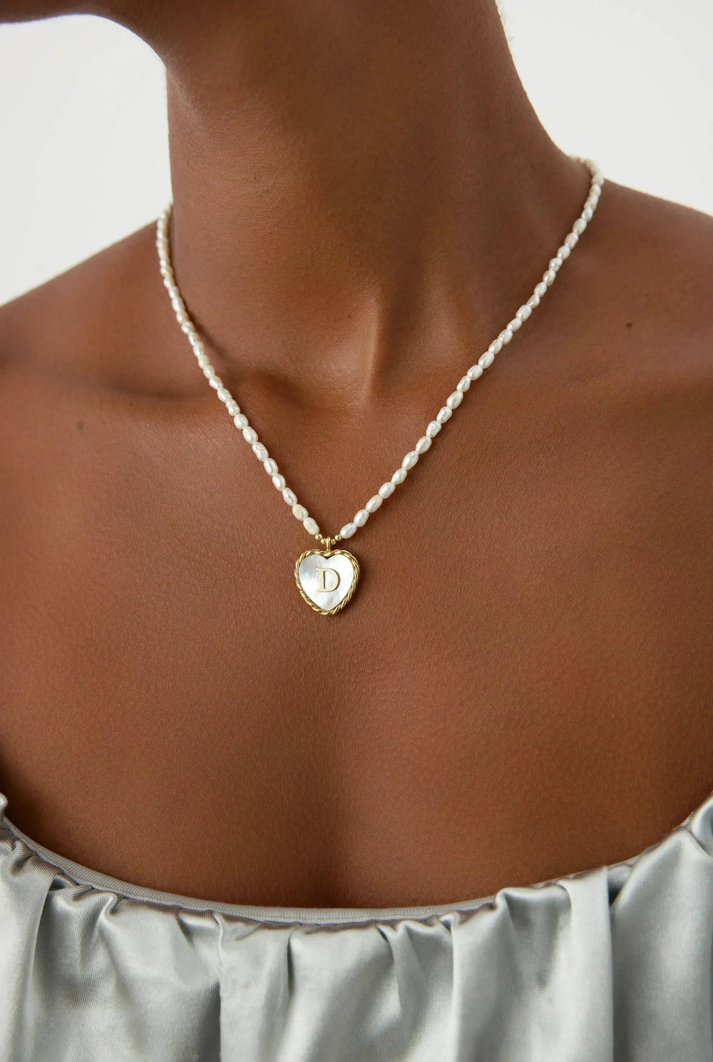 Handmade Pearl Beaded Heart Letter Necklace • Mother Of Pearl Heart Charm • Letter Necklace for Women